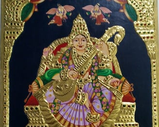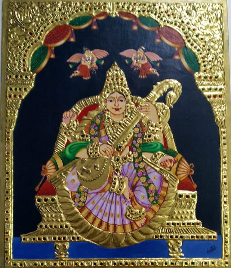 Tanjore paintings, also known as Thanjavur paintings, are a prominent form of art from the Tanjore region in Tamil Nadu, India. These exquisite paintings originated in the 16th century during the reign of the Nayak dynasty. Tanjavur paintings are characterized by their rich colors, intricate details, and the use of gold foils, which give them a distinct and royal appearance. The subjects of these paintings are usually Hindu gods and goddesses, along with scenes from mythology and religious texts. The artists use a combination of natural dyes, precious stones, and gold to create these masterpieces. The art form has evolved over the centuries, blending influences from various cultures, resulting in a unique and captivating style. Tanjavur paintings continue to be highly regarded for their beauty, craftsmanship, and cultural significance.